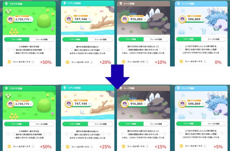 フィールドボーナスが上がると、同じ行動でも得られるエナジーが増えるため、カビゴンのランクが上がりやすくなります。