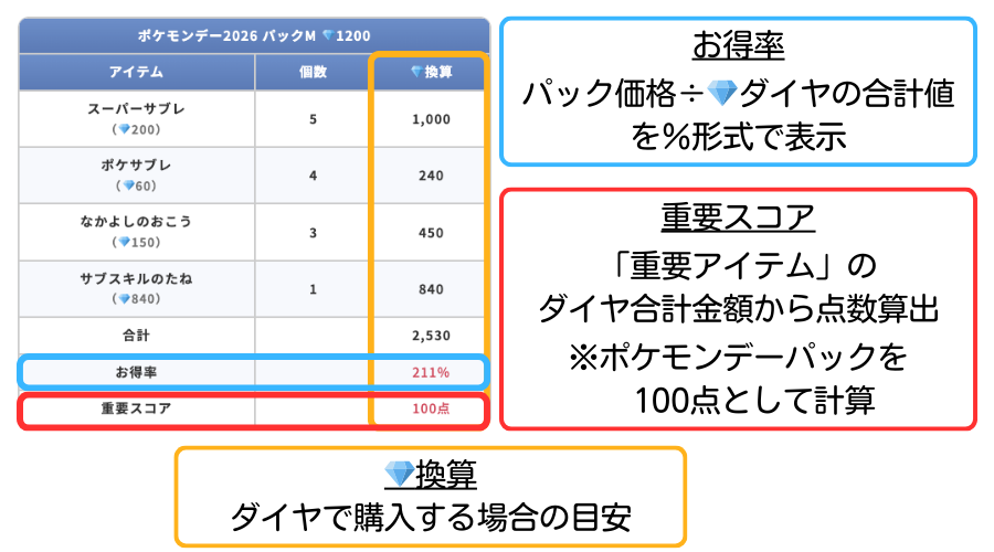 重要スコアは、お得なパックとして名高い“ポケモンデーパック”の重要アイテムのお得率を100点として計算しています。