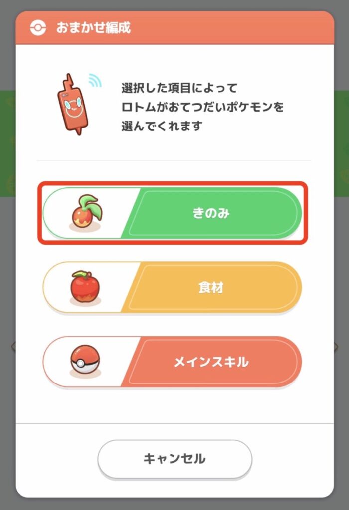 5匹以上ポケモンがいる場合は、おまかせ編成で「きのみ」を選ぶと、きのみのエナジーが最も高いポケモンTOP5をロトムが選んでくれます。