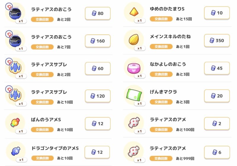 メインスキルのたねやラティアスのおこうなどがある程度交換できたら、自分のプレイに必要なアイテムと交換しましょう。